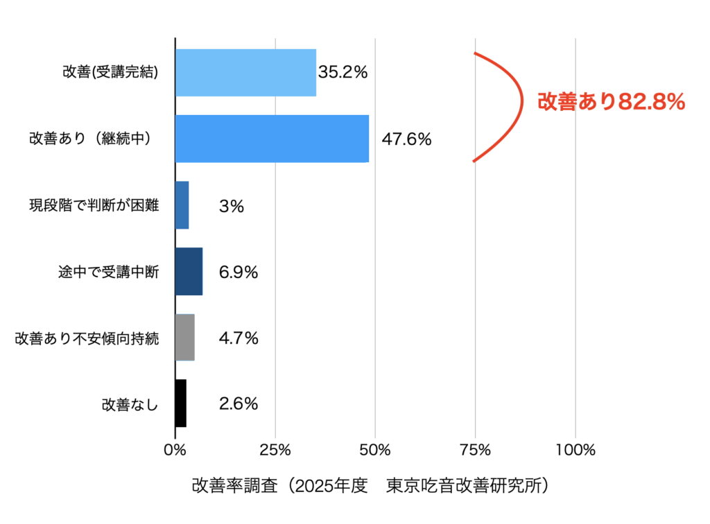そのため、東京吃音改善研究所では一人ひとりに合わせたアプローチを行なっており、昨年度のデータでは10人のうち約8人の方が改善を実感されていらっしゃいました。